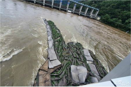 6일 급류에 유실된 춘천시 의암호 수초섬이 의암댐과 인접한 신연교 교각에 걸려 있다. (사진=손경식 기자)