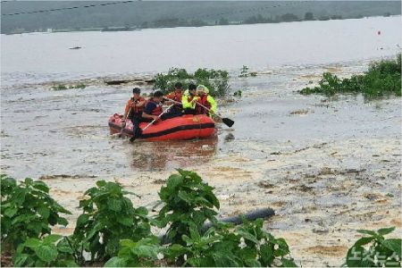 '필사의 탈출' 5일 한탄강 범람으로 마을이 물에 잠겨 고립된 철원군 동송읍 이길리 주민들이 소방 구조대에 의해 마을을 빠져 나오고 있다.(사진=주민 김용덕 씨 제공)