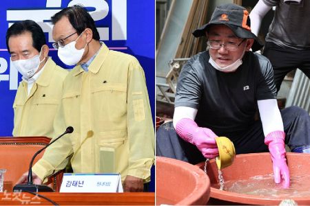 더불어민주당 이해찬 대표(오른쪽)와 정세균 국무총리(왼쪽)가 수해 대책과 4차 추경 논의 고위당정협의에 참여한 모습. 미래통합당 주호영 원내대표가 수해 작업에 나서고 있다. (사진=윤창원 기자/연합뉴스)