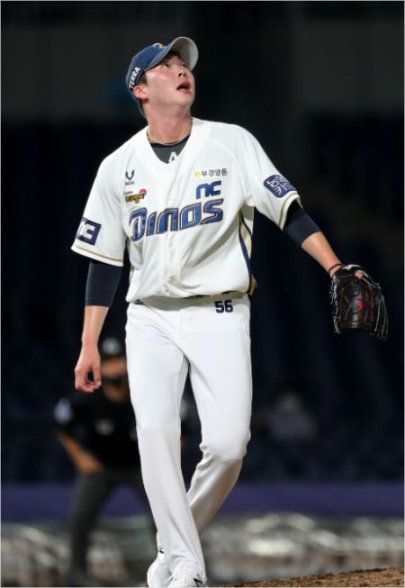 '아뿔싸!'14일 경남 창원NC파크에서 열린 프로야구 LG 트윈스-NC 다이노스 경기에서 트레이드 후 8회에 첫 등판한 NC 투수 문경찬이 LG 홍창기에게 우월 2점 홈런을 맞고 타구를 바라보고 있다. (창원=연합뉴스)