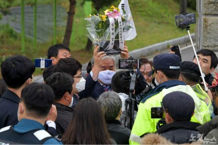 전광훈 목사가 지난 4월 보석 결정으로 석방된 뒤 경기도 의왕 서울구치소를 나서며 선물 받은 화분을 들어보이고 있다.(사진=박종민 기자/자료사진)