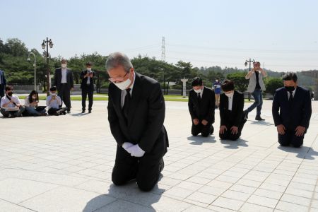 미래통합당 김종인 비상대책위원장이 19일 광주 5·18 민주묘지를 찾아 참배하면서 무릎을 꿇었다.