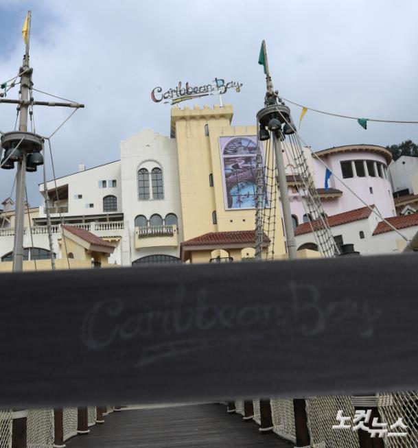 20일 오전 코로나19 확진자 방문으로 임시 휴장에 들어간 경기 용인시의 워터파크 캐리비안 베이 입구가 굳게 닫혀 있다. 에버랜드는 이날 공지문을 통해 "지난 18일 캐리비안 베이를 다녀간 고객이 코로나19 양성판정을 받아 즉시 방역을 위한 임시휴장을 결정했다"며 "이미 입장한 700여 명은 안내 후 퇴장 및 환불 조치를 하고 있다"고 밝혔다