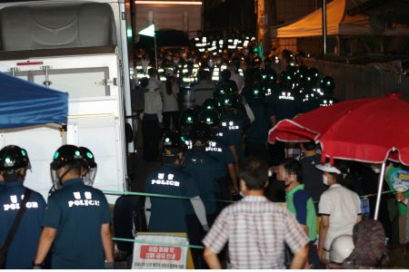 지난 20일 오후 신종 코로나바이러스 감염증(코로나19) 확진자가 다수 발생한 서울 성북구 사랑제일교회에서 관계자 및 신도들과 경찰이 중대본의 역학조사 중 대치하고 있다.(사진=연합뉴스)