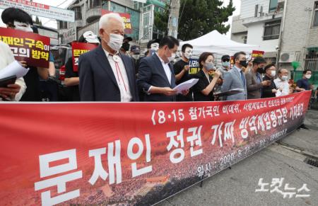 서울 성북구 사랑제일교회와 관련한 코로나19 확진자가 늘고 있는 21일 오전 전광훈 목사의 변호인단이 서울 성북구 사랑제일교회 앞에서 기자회견을 열고 전 목사의 성명서를 대독하고 있다.