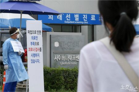 인턴, 레지던트 등 종합병원에서 수련하는 전공의들이 순차적 파업에 돌입한 21일 서초구 가톨릭대학교 서울성모병원에 파업으로 인해 코로나 검사를 시행하지 않는다는 안내문이 설치돼 있다. 이한형기자