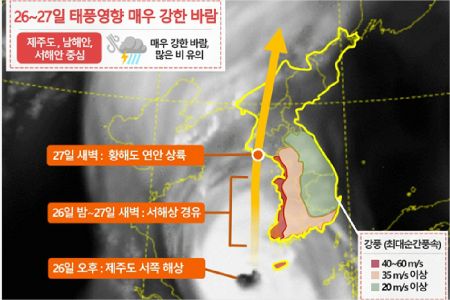 26일 낮에는 최대 순간 풍속이 시속 140에서 200㎞에 이를 정도로 거센 바람이 예상된다.