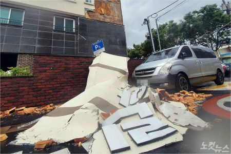 강력한 바람에 제주시 이도동에 있는 한 8층짜리 아파트 건물 외벽이 떨어져 나가기도 했다. 외벽 자재가 바닥으로 떨어지면서 일대는 아수라장으로 변했다. 특히 인근에 주차돼 있던 차량 위로 외벽 일부가 떨어지면서 차 유리 등이 파손됐다.