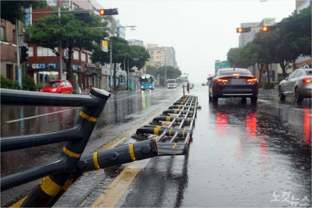 26일 오후 제주시 일도2동 도로 중앙분리대가 강풍으로 엿가락처럼 휘었다.(사진=고상현 기자)