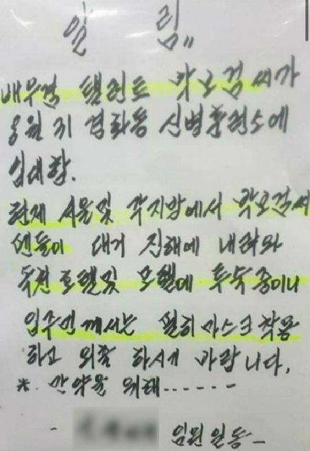 안내문에는 "배우 겸 탤런트 박보검씨가 경화동 신병훈련소에 입대한다. 현재 서울과 각 지방에서 팬들이 대거 진해에 내려와 속천 호텔과 모텔에 투숙 중이니 입주민께서는 필히 마스크 착용하고 외출해 달라"고 적혀 있다.