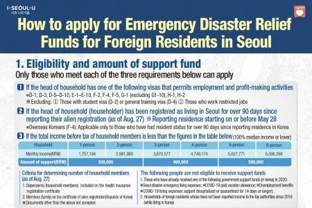 국가인권위원회 권고 및 서울시 방침에 따라 코로나 19로 인해 위기를 겪고 있는 국내 거주 외국인에게도 생활비를 지급하기로 결정한 것이다.