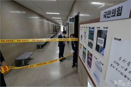 3일 오후 국민의 힘당 정책위의장실 근무하는 행정비서가 코로나 확진을 받은 가운데 방호요원들이 본청 2층을 폐쇄하고 있다. (사진=윤창원 기자)