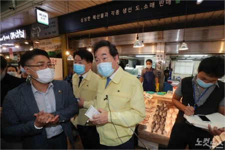 이낙연 더불어민주당 대표가 지난 2일 오후 서울 마포구 망원시장을 찾아 상인들을 만나고 있다. 이 대표는 이날 코로나19 재확산으로 지역경제 침체가 심화할 것으로 우려됨에 따라 시장을 방문해 현장의 의견을 청취했다. (사진=윤창원 기자)