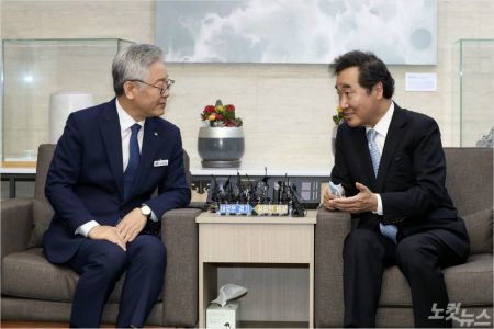 이낙연 대표와 이재명 경기도지사가 만나 대화하고 있다. (사진=이한형 기자/자료사진)