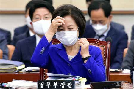 추미애 법무부 장관이 얼굴을 만지고 있다. (사진=윤창원 기자/자료사진)
