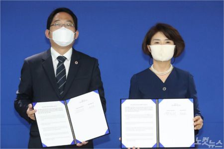 한정애 더불어민주당 정책위의장(오른쪽)과 최대집 대한의사협회장이 지난 4일 오전 서울 여의도 민주당사에서 정책협약 이행 합의서에 사인 후 포즈를 취하고 있다. 민주당과 의협 간 합의안에는 의료계에서 파업 철회 조건으로 내걸어 온 "의대 정원 확대, 공공의대 신설 추진 등을 원점에서 재검토한다"는 내용이 담겼다. (사진=박종민 기자/자료사진)