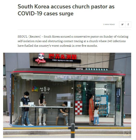 로이터가 전광훈 목사의 사랑제일교회가 한국 정부의 코로나19 대응에 훼방을 놓은 뒤 대중의 반발을 사고 있다고 8일(현지시간) 보도했다.
