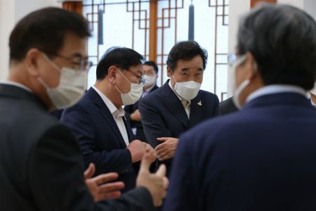 더불어민주당 이낙연 대표, 김태년 원내대표, 노영민 대통령 비서실장과 서훈 국가안보실장이 9일 청와대에서 열린 문재인 대통령과의 간담회에 참석, 문 대통령을 기다리며 대화하고 있다. (사진=연합뉴스)