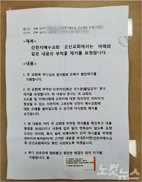한편, CBS 취재진이 내용증명 발송지인 신천지 군산지부를 방문해 발송인인 박OO씨 인터뷰를 요청했지만 만날 수 없었다.
