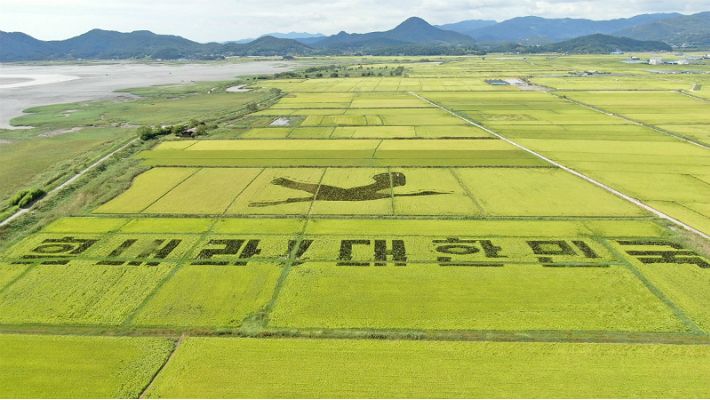 올해는 농가와 주민 의견을 수렴해 일반벼와 유색벼로 62㏊의 논에 비상하는 흑두루미와 문구를 새겼다.