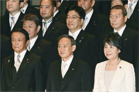 스가 요시히데 일본 총리(앞쪽 가운데)가 16일 오후 도쿄 지요다구 규덴에서 나루히토 일왕으로부터 임명장을 받은 뒤 다른 각료들과 함께 기념사진을 찍고 있다.(사진=연합뉴스)