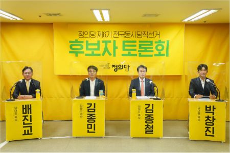 지난 14일 서울 여의도 정의당 당사에서 열린 ' 정의당 제6기 전국동시당직선거 당대표 후보자 토론회'에 배진교(왼쪽부터), 김종민, 김종철, 박창진 후보가 참석하고 있다. (사진=정의당 제공)