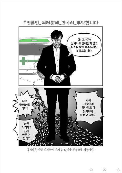 그는 "작년 하반기 검찰 수사가 진행되는 과정에서 정 교수는 심신이 쇠약해져 중간 중간 병원에 입원해야 했다"며 "기자들이 그 병원을 찾아가 병원 관계자들에게 병명이 뭐냐, 진짜 아프냐 등을 물으며 괴롭혔고, 정 교수는 병원을 여러 차례 옮겨야 했다"고 설명했다.