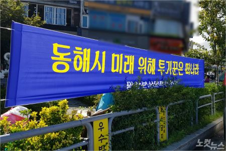 동해안권경제자유구역 망상 제1지구 개발사업시행자 선정에 반발하는 내용의 현수막이 동해지역 곳곳에 걸려있다.(사진=독자 제공)