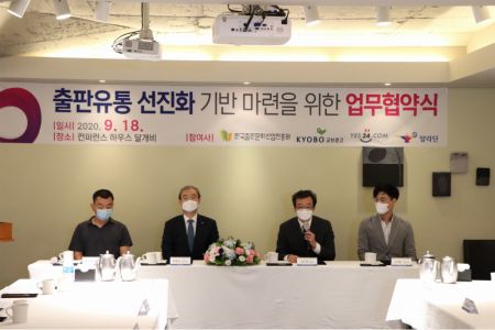 한국출판문화산업진흥원은 18일 서울 콘퍼런스 하우스 달개비에서 교보문고, 예스24, 알라딘 등 대형 도서유통업체 대표들과 '출판유통 선진화 기반 마련을 위한 업무협약'을 체결했다.