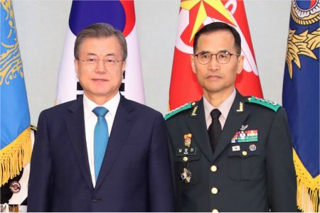 지난해 4월 15일 문재인 대통령이 청와대에서 남영신 지상작전사령관의 진급 및 보직신고를 받은 후 기념촬영을 하는 모습(사진=연합뉴스)