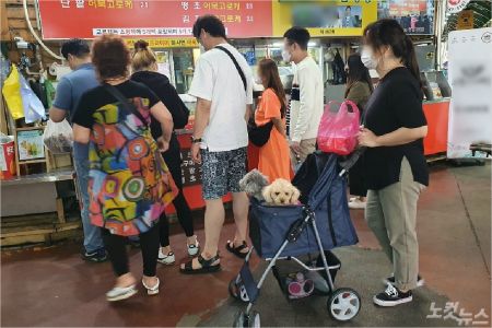 지난 22일 강릉 중앙시장의 한 어묵가게 앞에 관광객들이 주문을 위해 기다리고 있다. (사진=유선희 기자)