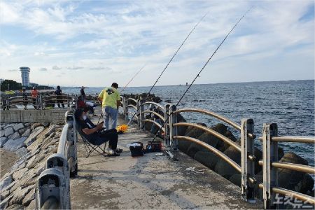 강릉 안목해변 일대에서 관광객들이 낚시를 즐기는 모습. (사진=유선희 기자)
