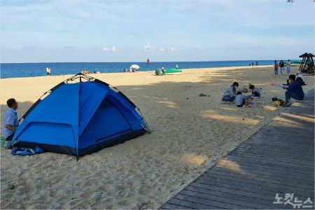지난 22일 강릉 경포해변 일대에서 텐트를 치고 여유를 즐기고 있는 관광객들. (사진=유선희 기자)