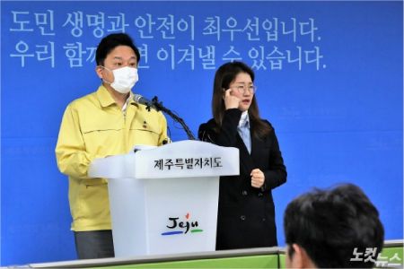 제주특별자치도 수어통역센터 배우리 팀장이 제주도의 코로나19 브리핑을 수어로 통역하고 있다.(사진=자료사진)