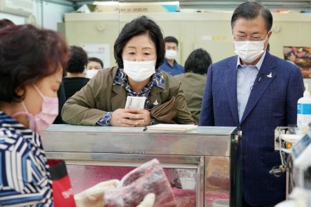 문재인 대통령과 김정숙 여사 내외는 29일 추석 연휴를 맞아 재래시장을 방문해 코로나19로 어려움을 겪는 상인들을 격려했다.