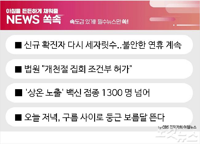 1. 코로나19 확진자 다시 세 자릿수...연휴 뒤 급증 우려추석 연휴 첫날이었던 어제 코로나19 확진자 수가 다시 세 자릿수로 늘면서, 우려가 현실이 되는 것 아니냐는 걱정이 나옵니다. 어제 코로나19 신규 확진자 수는 113명으로 38명을 기록한 그제보다 3배 가까이 급증했습니다. 50명 미만을 유지하던 국내 지역발생이 93명으로 두배 가까이 늘었는데, 이중 상당수가 서울과 경기, 인천 등 수도권에 집중돼 있습니다.