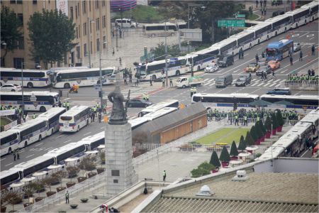 개천절인 3일 오전 서울 광화문 도로에 돌발적인 집회·시위 등을 차단하기 위한 경찰 버스가 줄지어 서있다. (사진=연합뉴스)