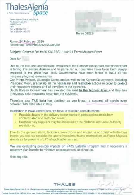 우리 군은 425 위성의 주요 부품을 이탈리아 업체에서 도입키로 했는데, 이탈리아 정부가 코로나19로 인해 공장 등 주요 기관들을 폐쇄하는 조치에 들어간 게 화근이 됐다. 또 유럽 국가 간 이동이 제한된 가운데 각지에 흩어져 있는 해당 업체의 공장들이 부품을 생산해도 수출하지 못하고 있다.