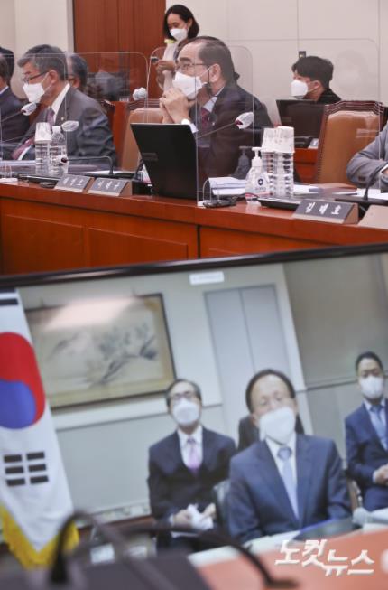 12일 오전 서울 여의도 국회에서 열린 외교통일위원회의 주미대사관 등에 대한 국정감사에서 국민의힘 태영호 의원이 이수혁 주미대사에게 질의하고 있다. 이날 주미대사 국정감사는 화상회의 방식으로 진행 되었다.