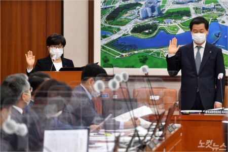 김진숙 한국도로공사 사징(왼쪽)과 권병윤 한국교통안전공단 이사장이 12일 국회에서 열린 국토교통위원회의 한국도로공사-한국교통안전공단에 대한 국정감사에서 선서를 하고 있다.(사진=윤창원 기자)
