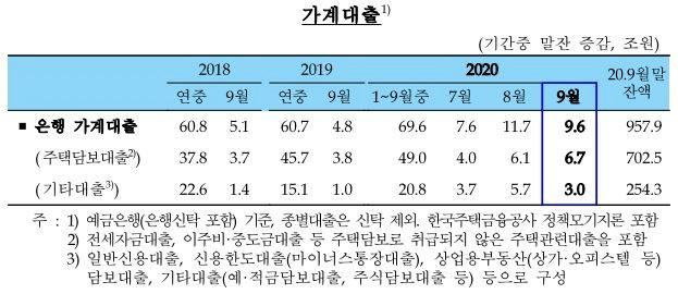 9월 가계대출의 경우 2004년 통계작성 이후 월별 증가액 기준으로 사상 최대를 나타냈다. 지난달에도 주택담보대출과 전세자금대출, 신용대출 증가세가 이어졌다.
