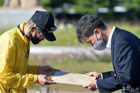북한 피격 사망 공무원 A씨의 형 이래진씨가 지난 8일 서울 청와대 분수대 앞에서 고영호 청와대 시민사회수석 비서관실 행정관에게 A씨의 아들이 작성한 원본 편지를 전달하고 있다.(사진=박종민 기자)