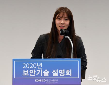 조폐공사 명예홍보대사인 배우 손담비가 14일 오전 서울 중구 대한상공회의소에서 열린 한국조폐공사 '2020 보안기술 설명회'에 참석해 인사말 하고 있다.