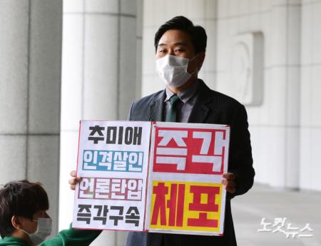 시민단체 법치주의 바로세우기 행동연대(법세련) 이종배 대표가 16일 오후 서울 서초구 대검찰청에서 기자회견을 열고 추미애 법무장관이 지난 15일 자신의 아파트서 대기하던 사진기자의 얼굴을 SNS에 게재한 것에 대해 명예훼손 혐의로 고발한다고 밝히고 있다.