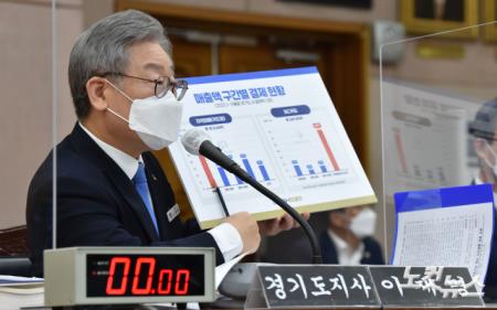 이재명 경기도지사가 19일 경기도 수원시 팔달구 경기도청에서 열린 국회 행정안전위원회의 경기도에 대한 국정감사에서 의원 질의에 답변하고 있다. (사진공동취재단)
