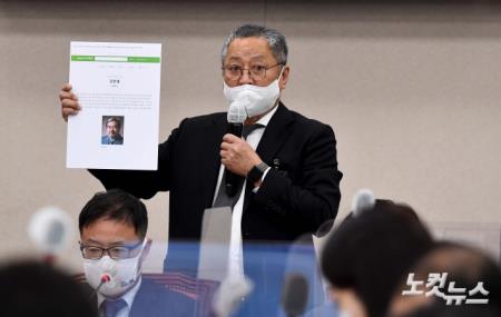최창희 공영홈쇼핑 대표가 19일 서울 여의도 국회에서 열린 산업통상자원중소벤처기업위원회 국정감사에서 이수진 더불어민주당 의원이 제기한 특혜채용 의혹에 대해 해명하고 있다.