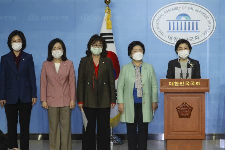 국회 여성가족위원회 소속 국민의힘 김정재(오른쪽 부터), 서정숙, 양금희, 전주혜, 김미애 의원이 20일 서울 여의도 국회 소통관에서 정의기억연대, 박원순, 오거돈 사건 관련자들의 국정감사 증인과 참고인 채택을 촉구하고 있다. (사진=연합뉴스)