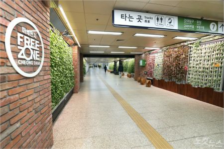 사시사철 푸르름이 넘쳐 나고 있는 지하철 7호선 청담역 지하보도 미세먼지프리존(사진=박다솔 PD)