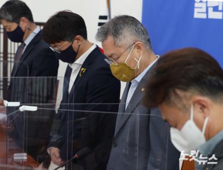열린민주당 최강욱 대표가 21일 오전 국회에서 4·16 세월호참사 가족협의회를 만나 간담회를 하기 앞서 희생자들을 위한 묵념을 하고 있다.