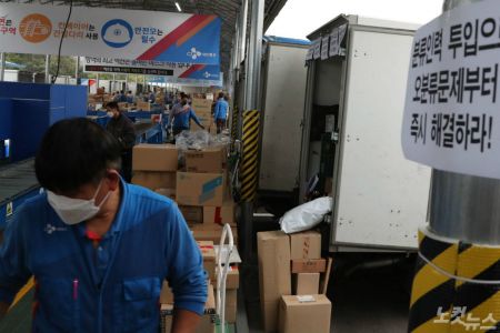 그러면서 "택배노동자 과로사 대책위는 문제 해결을 위해 추석 이전부터 분류작업 별도인력 투입을 요구했고, 재벌 택배사들은 추석 전 2067명을 투입하겠다고 약속했다"며 "하지만 실제로는 400명에도 미치지 못하는 숫자의 추가인력만을 투입했다. 거짓, 꼼수로 일관하며 구조적 상황을 방치했다"고 비판했다.